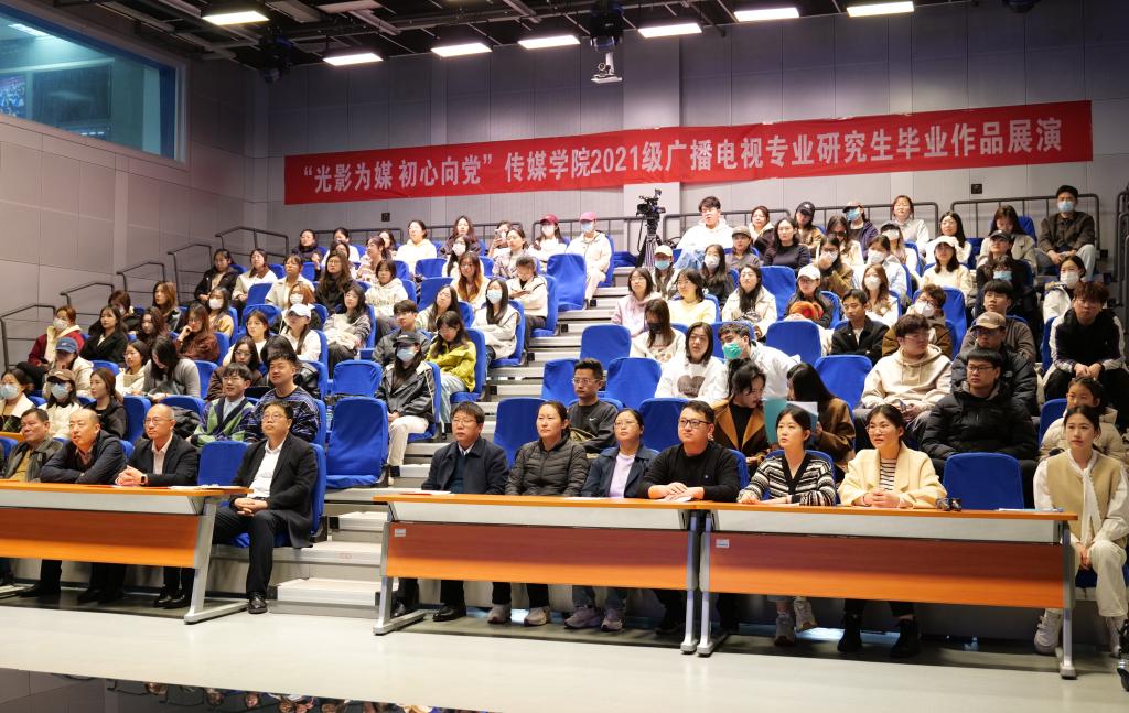 传媒学院讯 近日,传媒学院举办“光影为媒 初心向党”2021级广播电视专业研究生毕业作品展演。传媒学院党委书记田维柱、院长王焕景、党委副书记田荣林、副院长赵可云、团委书记张守荣及学院各党支部书记出席活动,广播电视专业研究生和本科生参加活动。