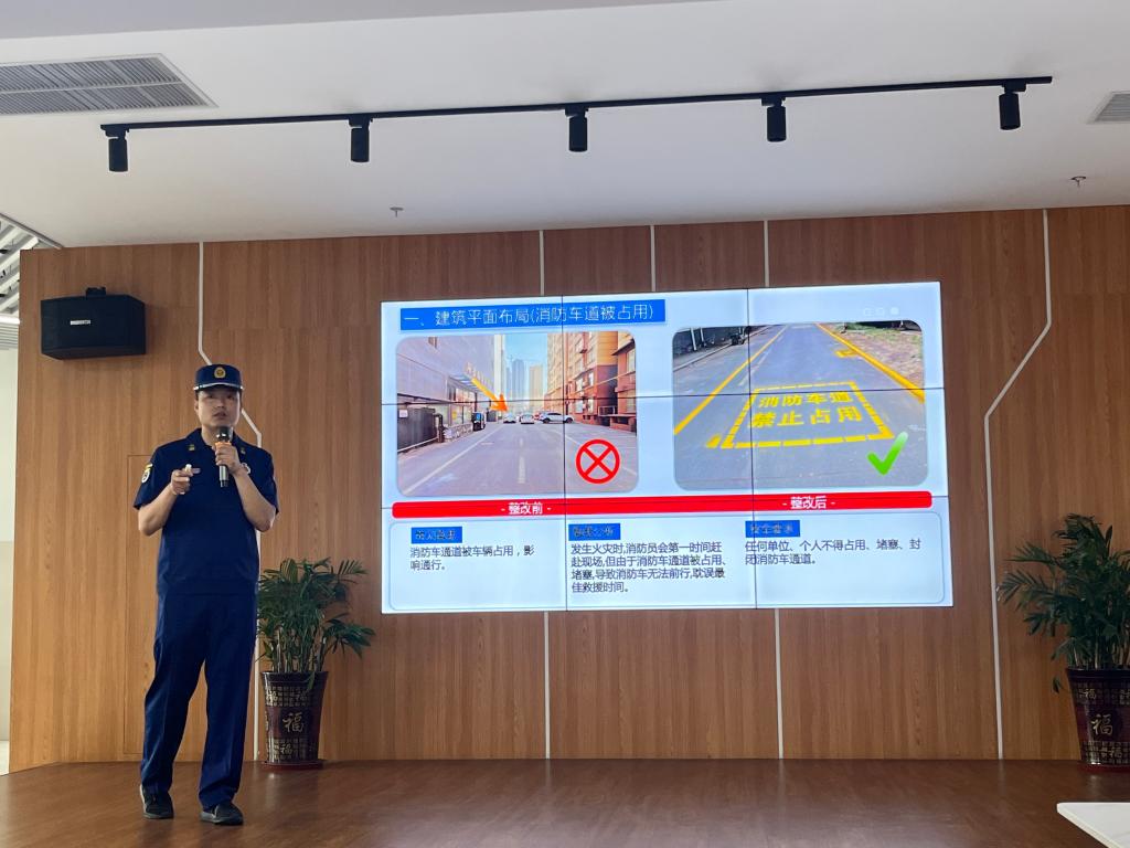 王磊首先从实用消防法律法规、消防安全隐患识别与消除、消防安全技能实操、消防安全培训组织与实施等四方面开展了消防技能培训与知识考核。模拟现场实操环节,所有人员在消防员的专业指导下现场操作演练了消防栓及灭火器的使用,做到了掌握要领、操作规范,达到了预期效果。