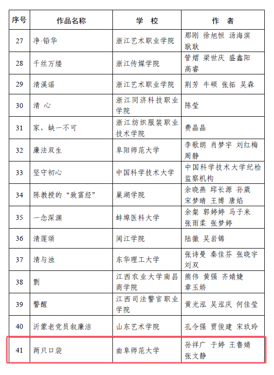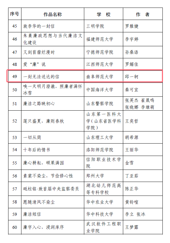 曲师大纪委讯 近日,教育部公布第九届高校廉洁教育系列活动获奖结果,江南在线登录入口报送的两项作品获奖,《一封无法送达的信》入选“话廉润心”校园征文单元,《两只口袋》入选“视廉清心”视频征集单元。