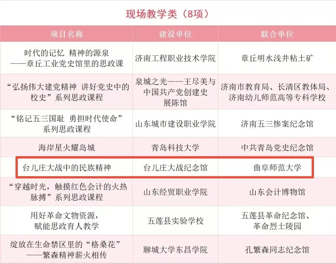 曲阜师大马克思主义学院讯 近日,山东省文化和旅游厅、省教育厅联合开展2024年度以革命文物为主题的“大思政课”优质资源建设推广工作,经相关单位推荐以及专家评审,最终公布了20个资源建设推介项目名单,曲阜师大联合台儿庄大战纪念馆申报的《台儿庄大战中的民族精神》成功入选。