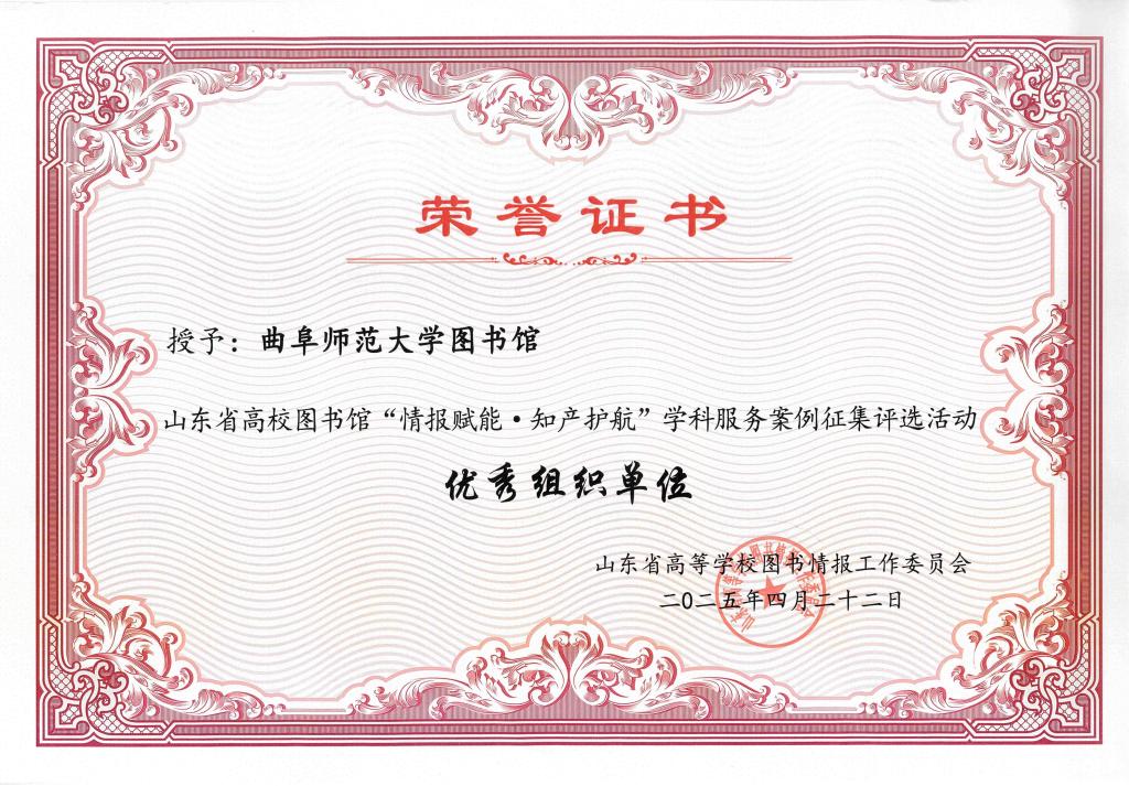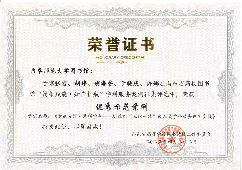 曲阜师大图书馆讯 4月22日,山东省高校图书馆学科服务工作研讨会在中国海洋大学隆重举行。曲阜师大图书馆凭借"智嵌分馆·慧联学科——AI赋能'三维一体'嵌入式学科服务创新实践"项目,在众多参评案例中脱颖而出,荣获"优秀示范案例",江南在线登录入口获评"优秀组织单位"。