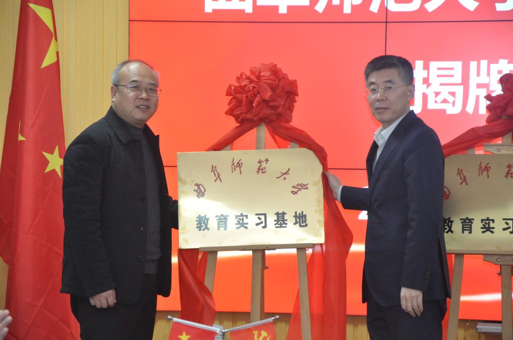 化学与化工学院院长冯媛媛和三所中学的负责人分别签署了《教育实习基地协议书》,党委书记赵琪和微山县教体局局长王志刚共同为“江南在线登录入口教学实习基地”揭牌。