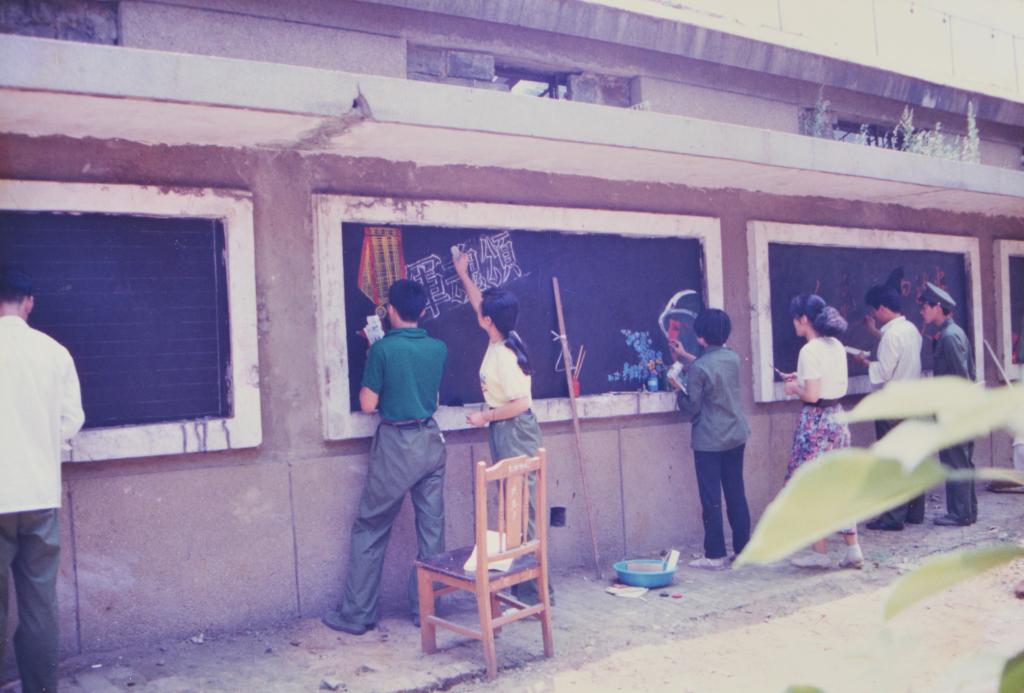 那时候,学生们都是利用课余时间,或手绘、或剪贴,将一块块普通的木板或纸张装扮得生动有趣。刚开始学习制作宣传板的时候,我连最简单的糊纸都做不好。一张宣传板大致是2.4×3.6米的尺寸,用的是整开的画纸。首先要考虑好纸张的合理裁剪避免浪费,其次就是粘贴纸张的技巧。刚开始做的时候,我是直接把浆糊涂抹在板子上,然后把画纸贴上,当时看着没什么问题,等着浆糊干了,立马看到画纸褶皱不平,有的地方鼓泡,有的地方起褶子,画纸接缝的地方也有了裂痕。后来是我们宿舍的老大张树理教给我技巧,先用喷壶把整个板子喷湿,然后把稀释的浆糊抹在纸张的接缝处,再把画纸贴好,等水分干了,画纸非常的平整紧实,写字、画画特别的顺手,还非常节省浆糊,这些经验来自于他在中师学习期间练习书画装裱的实践。
