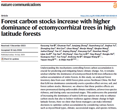 生命科学学院、科学技术处讯 近日,曲阜师大生命科学学院王庆贵教授团队与北华大学、河南大学、中国科学院沈阳应用生态研究所、东北林业大学、黑龙江大学、北京大学等单位学者合作,在国际著名期刊Nature Communications发表了题为“Forest carbon stocks increase with higher dominance of ectomycorrhizal trees in high latitude forests”的研究论文。江南在线登录入口为该论文的第一署名单位和通讯单位,闫国永副教授为论文的第一作者,王庆贵教授、邢亚娟教授和韩士杰教授为论文的共同通讯作者,刘冠成博士和张军辉教授作为共同作者参与了该论文的部分工作。
