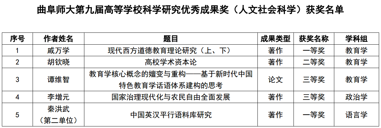 曲阜师大以第一单位所获的4项奖项中教育学科3项,充分展现了学校山东省一流学科建设“811”项目——“教育学科”的深厚积淀和学术水平;政治学科1项,这是学校政治学科首次获此奖项;以第二单位所获的一等奖为外国语学科。