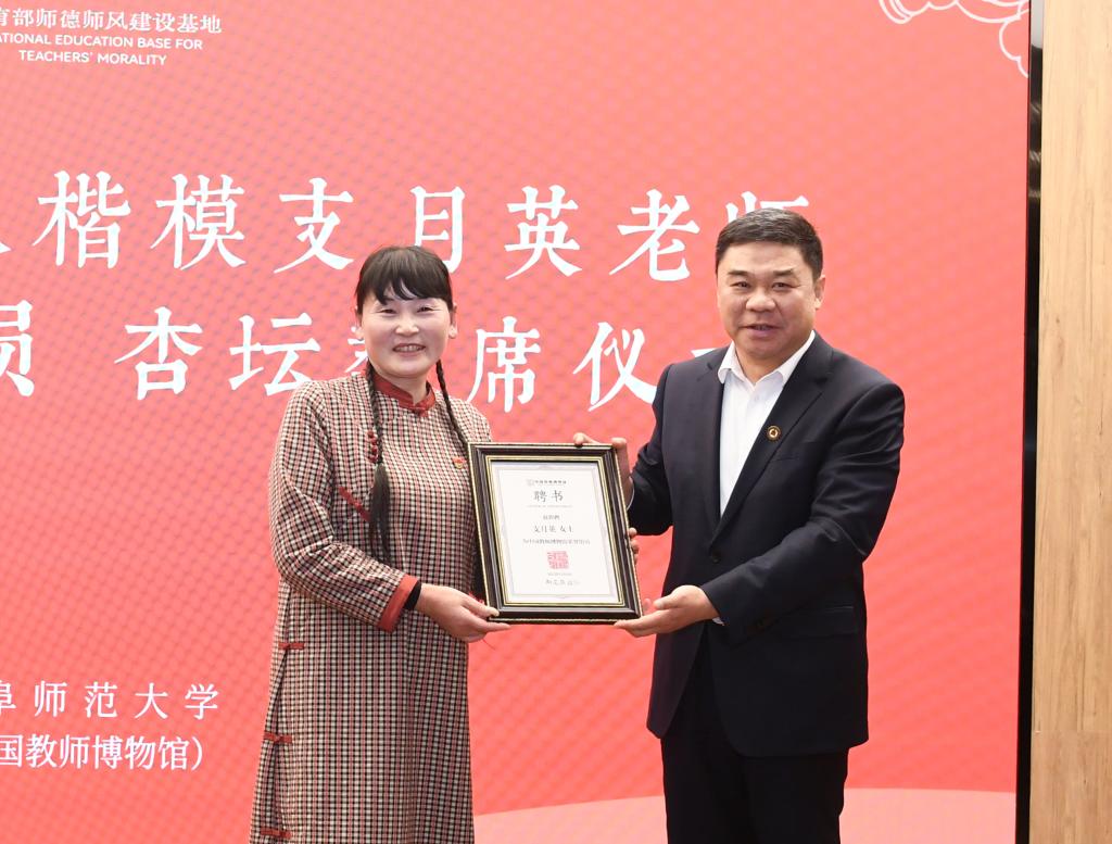 学校党委书记邢光会见了支月英老师,为她颁发荣誉馆员和“杏坛教席”聘书,代表学校向她表示敬意,希望她继续关心支持博物馆和师德教育基地工作,为师生上好“师德第一课”。党委常委、副校长李兆祥代表学校接受了支月英捐赠的“全国道德模范”证书、“全国教书育人楷模”奖杯、“最美奋斗者”奖杯、讲义教案等珍贵教书育人见证物。