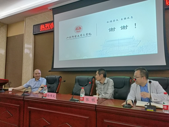 在报告评议阶段,张明教授对孙教授的学术修养和学术激情表达了敬意,并对报告内容进行了精彩评点。在提问环节中,现场学生踊跃发言。就同学们所提出的问题,孙教授耐心而细致地进行了解答。之后,李杰俊副院长对报告作了总结。本次报告内容丰富,气氛热烈,给人以启迪,文学院师生收获良多。
