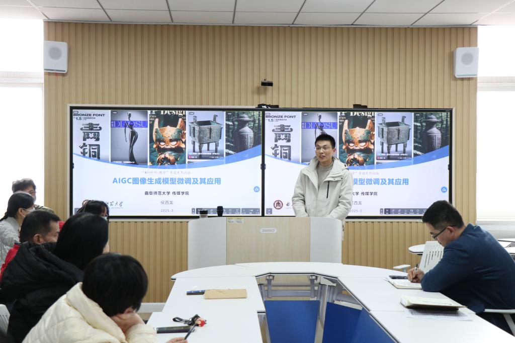 传媒学院副教授侯西龙以“AIGC图像生成模型微调及其应用”为题,系统阐述了AIGC的发展现状,解析了国内外开源图像生成模型的使用方式、稳定扩散模型的微调等技术,剖析了当前生成式人工智能领域中图像生成技术的最新进展与团队研究案例,并通过青铜器文物图像智能生成技术应用的创新案例,分享了AIGC技术在赋能文化遗产活化与辅助文物修复等方面的研究创新。与会教师就AIGC技术如何变革课程建设、教育资源开发、数字媒体创作范式、AI如何融入教学实验与教学活动等专题展开热烈讨论。